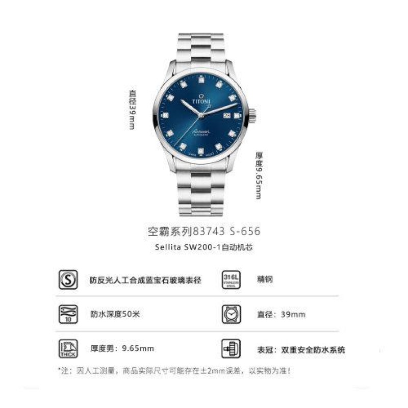 TITONI/梅花瑞士手表 空霸系列 简约时尚休闲 自动机械男表 39mm蓝盘钢带 83743-S-656 $838.3 |