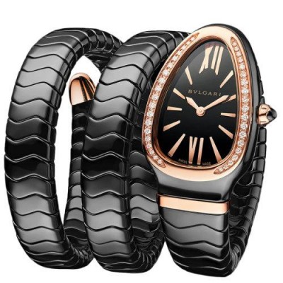 【 Tax included 】 Book 2-3 weeks BVLGARI/Bulgari 18K gold rose gold bezel with diamonds and black ceramic double helix bracelet. Black baked enamel dial and case. SERPENTI SPIGA quartz watch 35mm 102885
