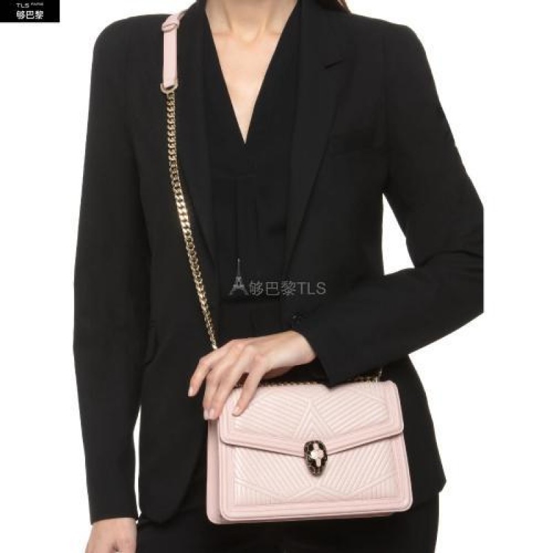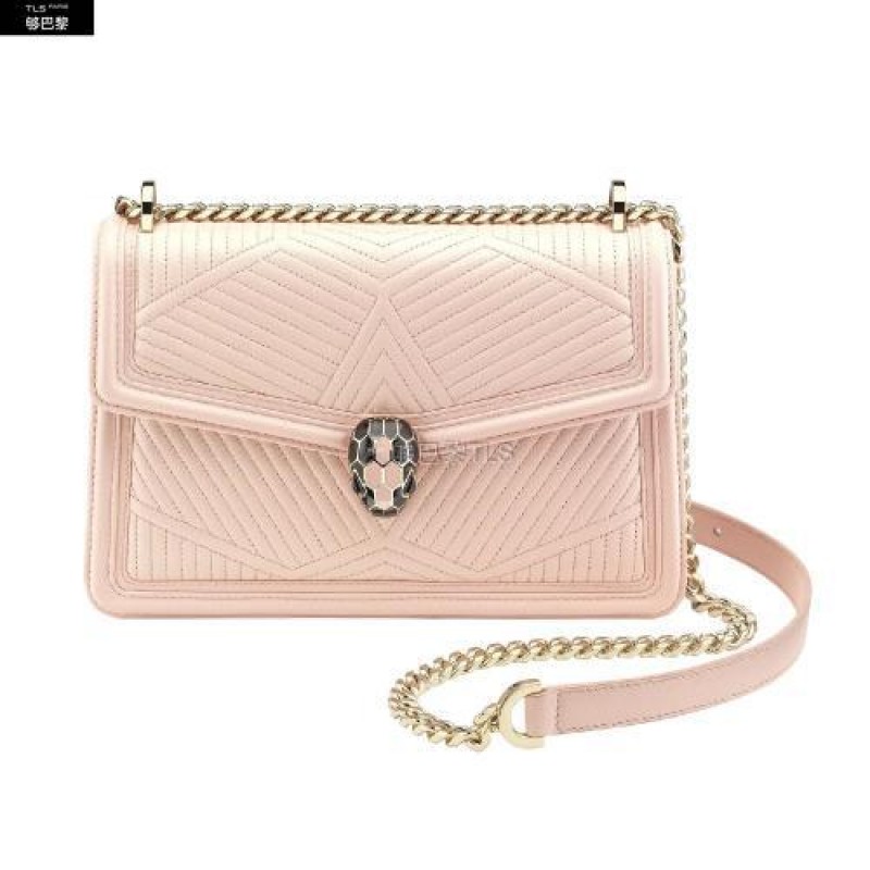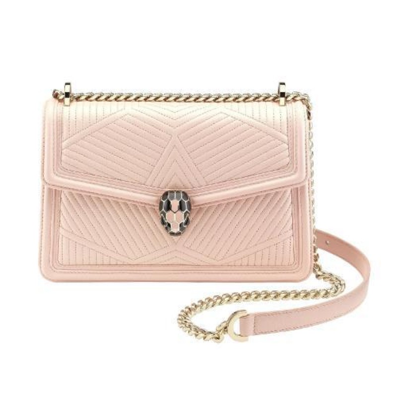 Revisite dans une nouvelle teinte chic, le sac a bandouliere Serpenti Diamond Blast presente des lignes nettes creant un contraste original avec un motif exclusif legerement *w*matelasse. Le corps du sac en cuir nappa couleur Crystal Rose s'agremente d'un motif *w*matelasse en trois dimensions, inspire des nombreuses facettes d'un diamant brillant. Son profil externe est rehausse d'un pourtour geometrique en cuir de veau ton sur ton. Fermoir emblematique Serpenti en laiton dore et email noir et couleur Crystal Rose avec yeux en onyx elegants. Accessoire ideal d'un look de jour sophistique, le sac se pare d'une chaine epaisse et d'une bandouliere en cuir ajustable pour plus de polyvalence. Petit modele dote d'un compartiment a soufflet, d'une poche a fermeture eclair a l’interieur et d'une poche plate. Plaque en metal ornee du logo Bvlgari a l’interieur et miroir de poche. D