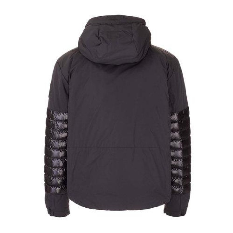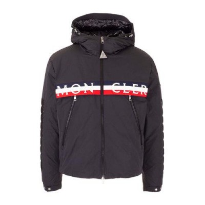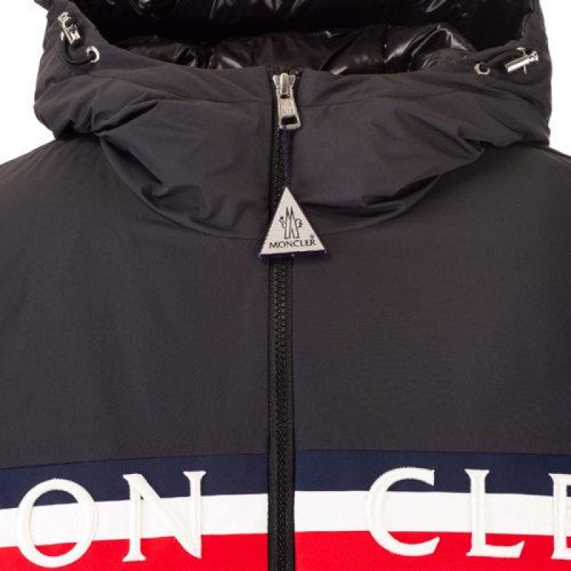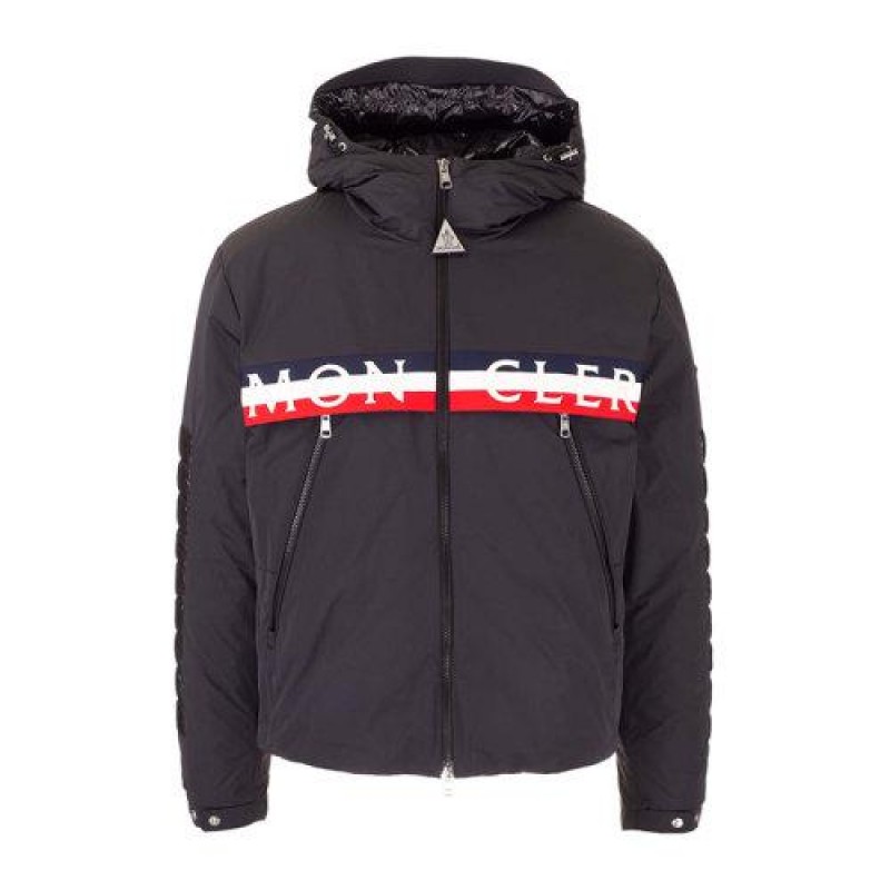 Moncler/蒙克莱 男士 服装 黑色连帽字母LOGO蓝白红条纹拉链口袋短款羽绒服 男士羽绒服