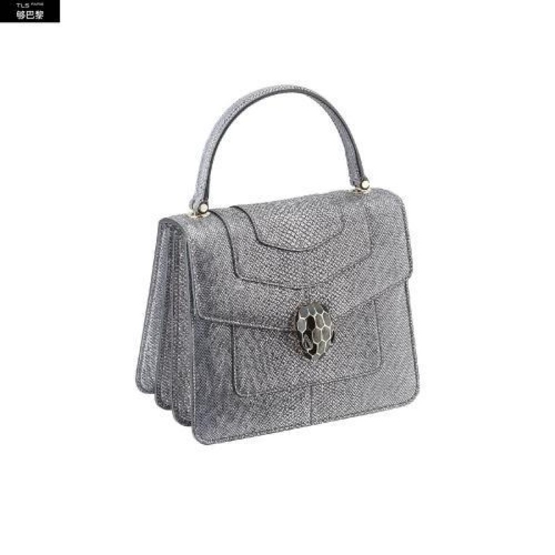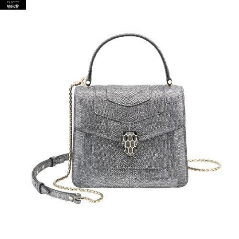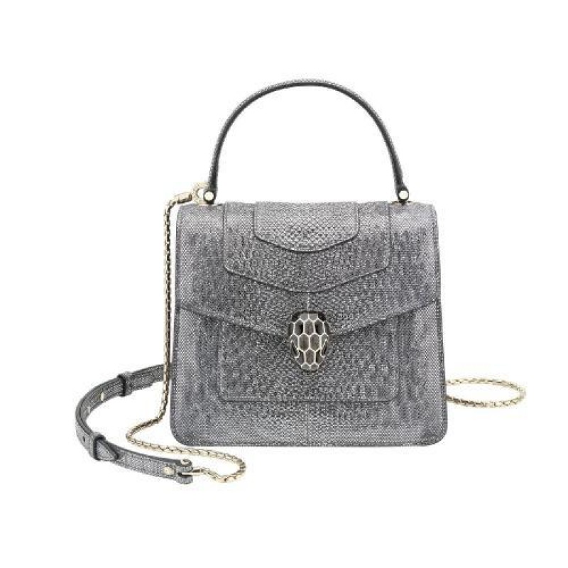 Ce sac a bandouliere Serpenti Forever en karung raffine a finition metallisee couleur Charcoal Diamond illustre le talent des artisans Bvlgari a transformer des materiaux precieux en des pieces intemporelles. Le fermoir emblematique Serpenti hypnotise avec ses ecailles en email couleur Charcoal Diamond scintillant et noir brillant et ses yeux en onyx au cha*W*rme envoutant. Sac a main dote de trois compartiments a soufflet et d’une chaine ondulante en forme de serpent ajustable et amovible pour un look polyvalent. Petit modele avec un miroir de poche. Dimensions : 18 x 15 x 9,5 cm.