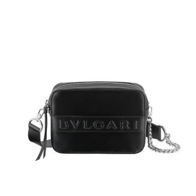 Nouveau modele s’inscrivant dans la tendance logomania, le sac pour appareil photo Bvlgari Logo illustre a merveille le style contemporain de la Maison. Ce modele en cuir de veau noir est rehausse de details en laiton. Accessoire ideal d’un look de jour unisexe, le sac se pare d’un compartiment a soufflet et d’une chaine ajustable et amovible avec bandouliere en cuir pour plus de polyvalence. Une poche ouverte a l’interieur, une poche exterieure et une anse a l’avant avec logo Bvlgari en relief permettant de fixer de petites pochettes completent l’ensemble. Petit modele dote d’une plaque en cuir ornee du logo Bvlgari. Dimensions : 19 x 13 x 6 cm.