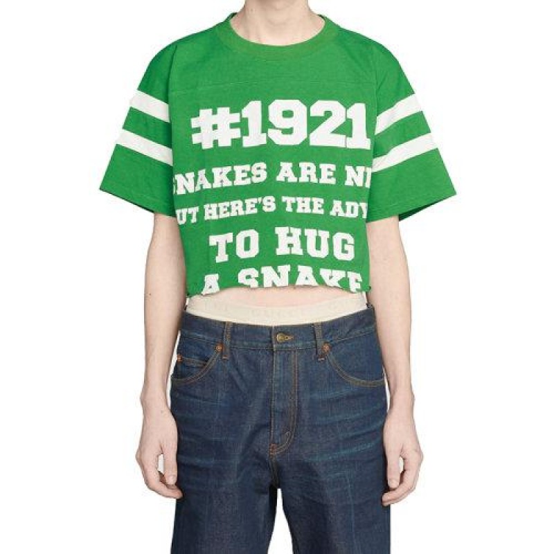 受温柔的英国童谣启发的版画与众议院的各种元素相结合,重新诠释了重要作品。在这件绿色T恤的正面,古驰(Gucci)创立之年伴随着这样的名言:“蛇很好,但这里是拥抱蛇的建议”。在背面,铭文“ Loved”和“ Sin Amore Nihil”揭示了品牌的浪漫灵感。