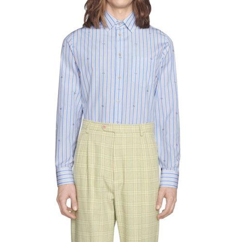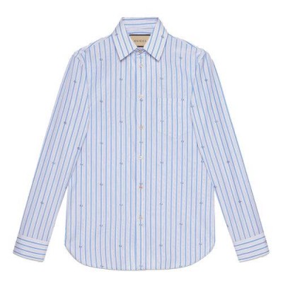浅蓝色fil双门轿跑车GG条纹图案是Gucci系列中经常出现的细节,并装饰了这款白色棉质衬衫,其特点是尖领和圆形袖口。