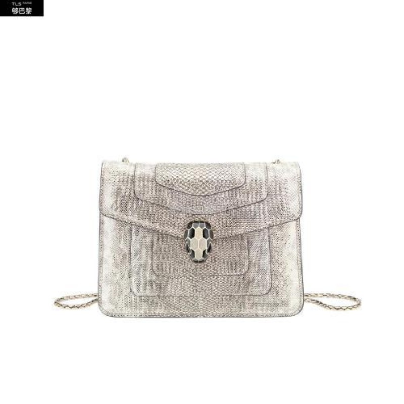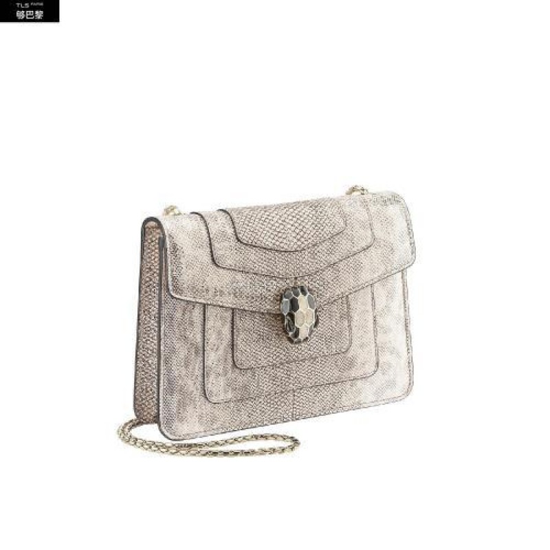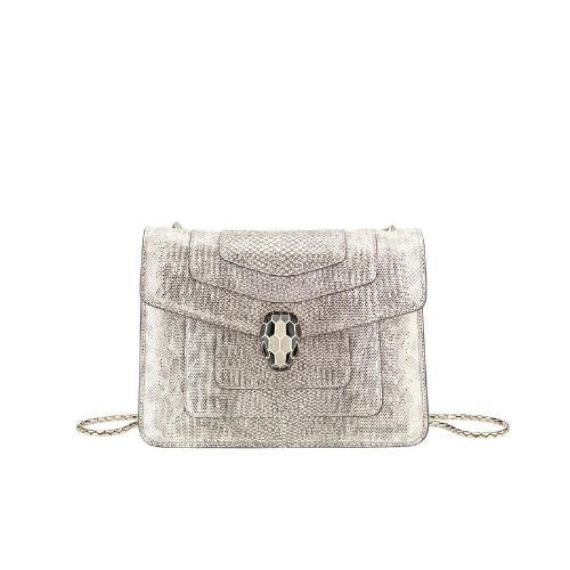 Ce sac a bandouliere Serpenti Forever en karung raffine a finition metallisee couleur Milky Opal illustre la capacite des artisans Bvlgari a transformer des materiaux precieux en des pieces intemporelles. Le fermoir emblematique Serpenti en email couleur Milky Opal scintillant et noir brillant hypnotise avec ses yeux en onyx au cha*W*rme envoutant. Une chaine en laiton dore, inspiree par les ondulations du corps du serpent, et un petit miroir de poche completent l’ensemble. Petit modele dote d’un compartiment a soufflet. Dimensions : 20 x 14 x 4,5 cm.