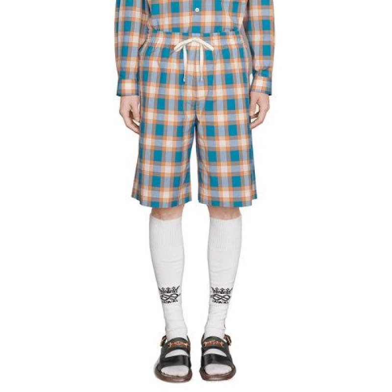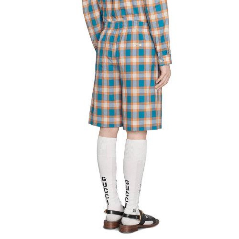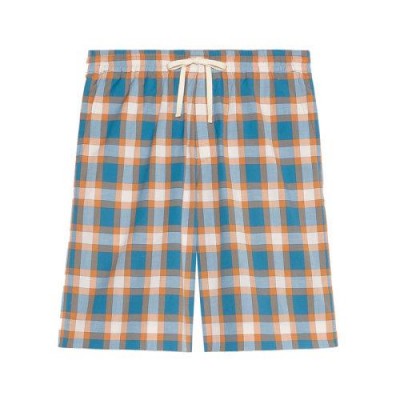 这些短裤由柔和色调的蓝色和橙色Madras格纹图案定义,散发出独特的复古感。腰部有抽绳的模型配有Gucci标签。