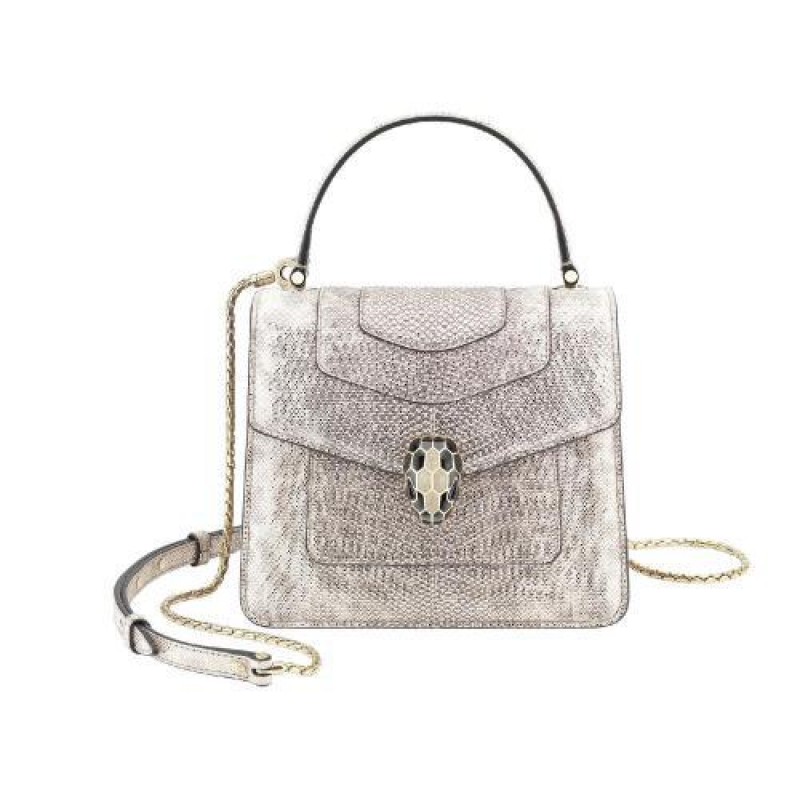 Ce sac a bandouliere Serpenti Forever en karung raffine a finition metallisee couleur Milky Opal illustre la capacite des artisans Bvlgari a transformer des materiaux precieux en des pieces intemporelles. Le fermoir emblematique Serpenti en email noir et couleur Milky Opal scintillant hypnotise avec ses yeux en onyx au cha*W*rme envoutant. Sac a main dote de trois compartiments a soufflet et d’une chaine en forme de serpent ajustable et amovible pour un look polyvalent. Petit modele avec un miroir de poche. Dimensions : 18 x 15 x 9,5 cm.