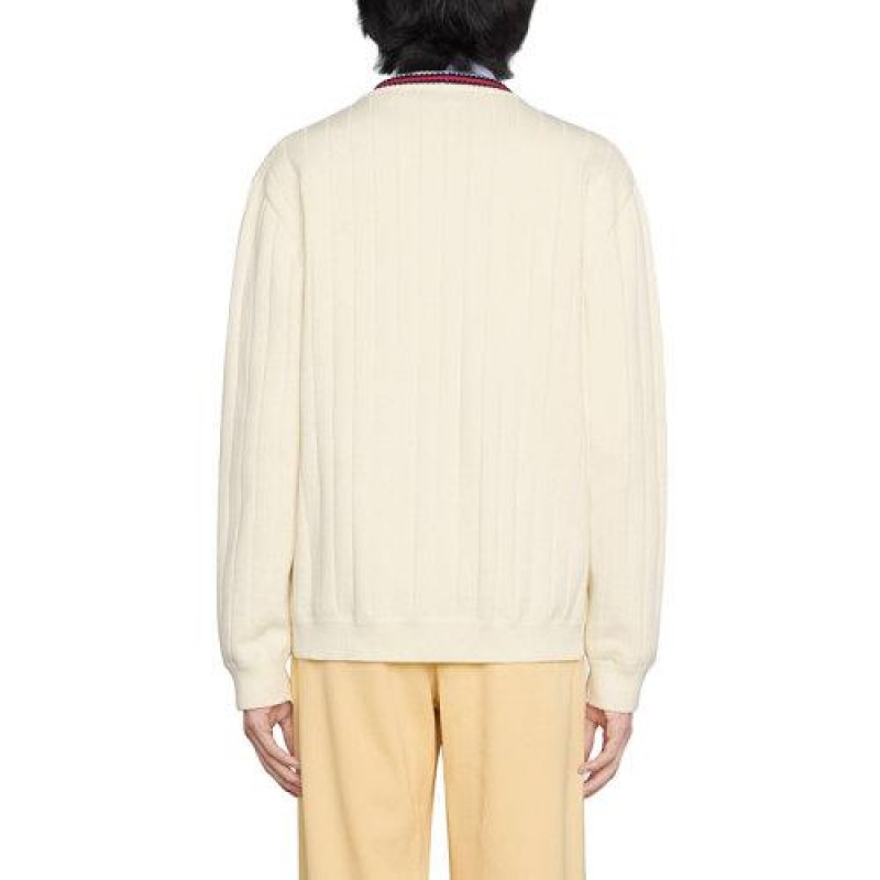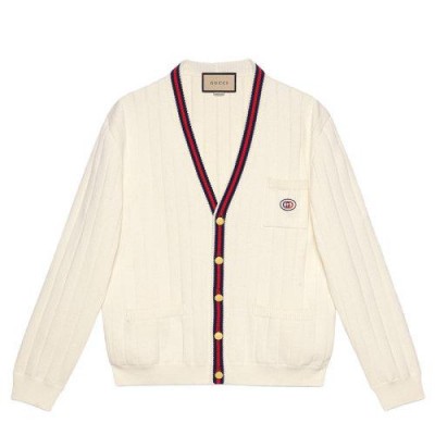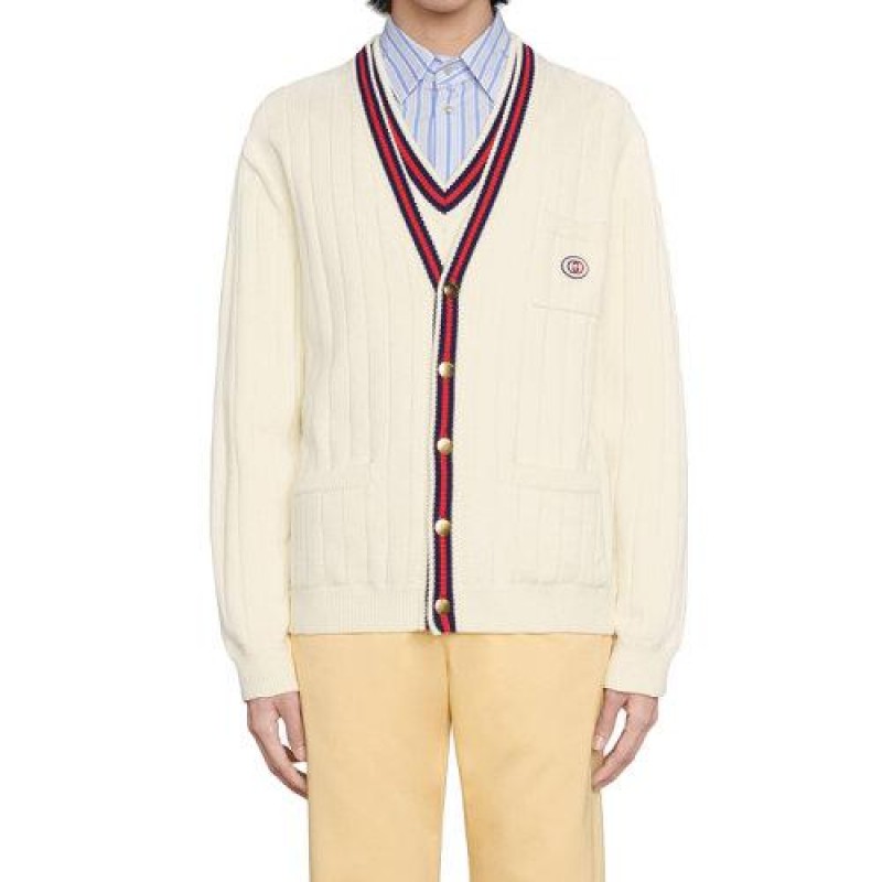 【包税】GUCCI/古驰 21年早秋新款 男士象牙色织带棉质针织V领开衫654984XKBUR9182