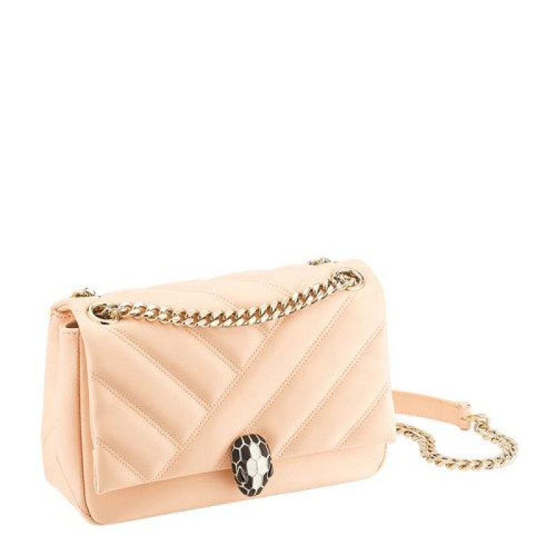 【包税】BVLGARI/宝格丽 SERPENTI CABOCHON系列女士蜜桃色绗缝小牛皮浅金镀金黄铜黑白珐琅经典蛇首扣单肩包斜挎包链条包女包 290612