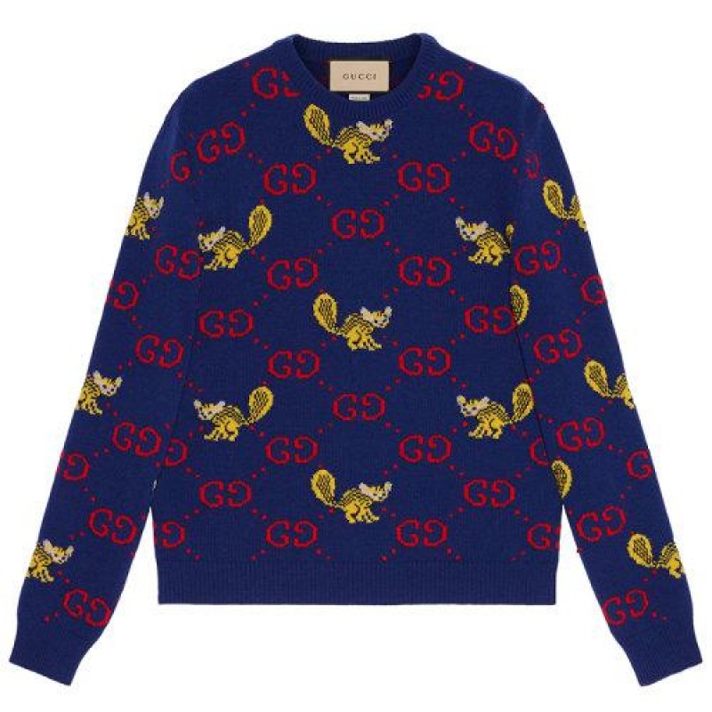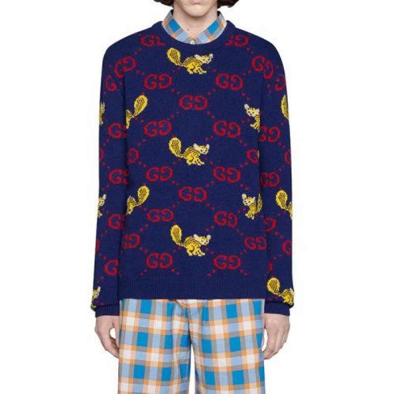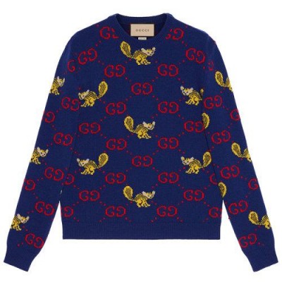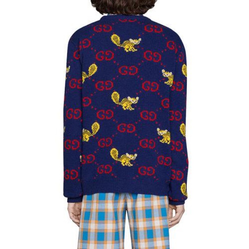 【包税】预订款1-2周 GUCCI/古驰 21年早秋新款 Freya Hartas系列 男士蓝色和红色动物印花羊毛毛衣661836XKBXX4795