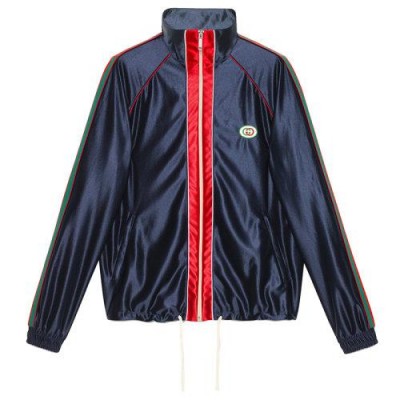 在整个Opening系列中,邀请了违反规范的闪亮面料。这款运动服式夹克采用柔软闪亮的技术涤纶平纹针织面料制成。迷人的深蓝色织物像帆布一样,展示了标志性的细节,例如马术风格的织带和GG细节轭。