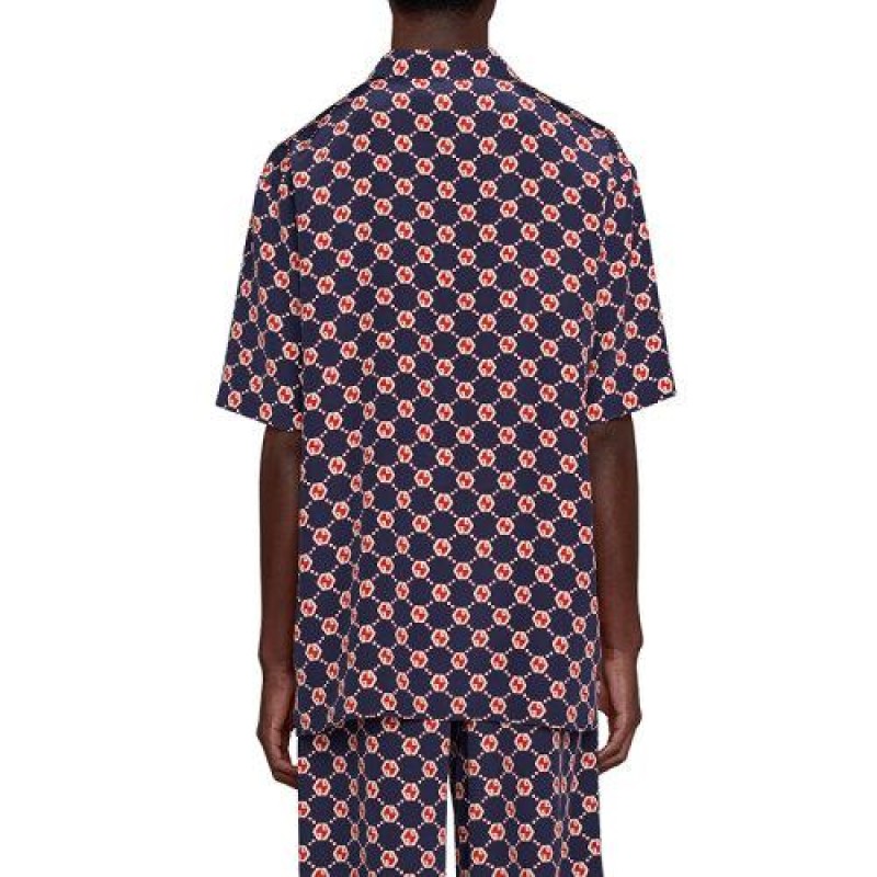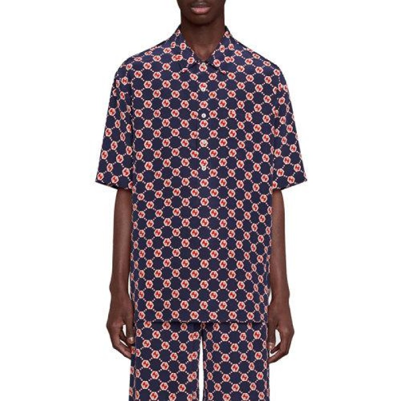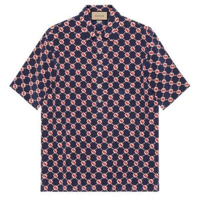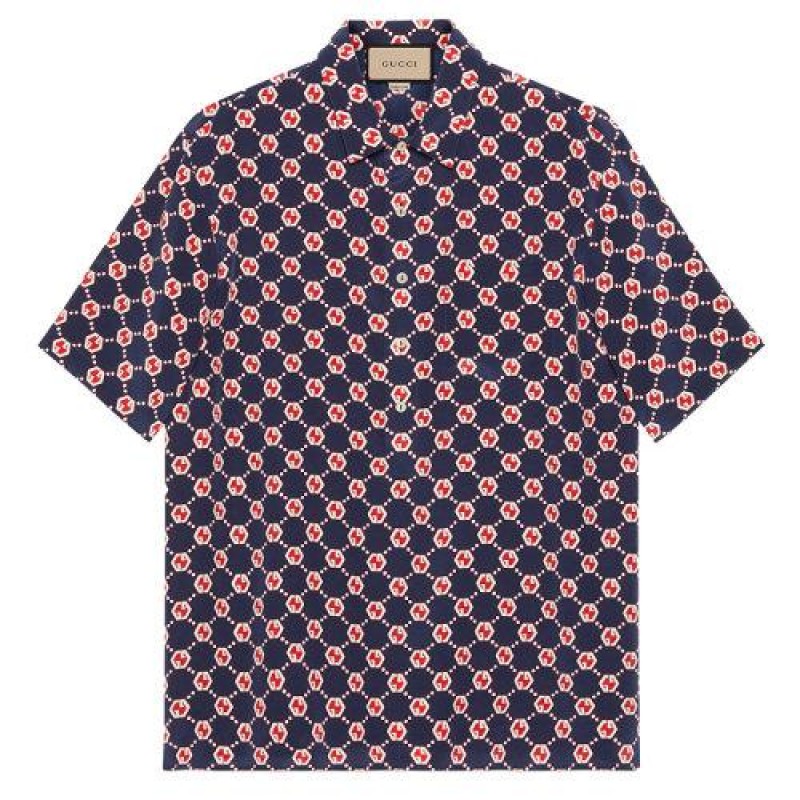 【包税】GUCCI/古驰 21年春夏新款 男士蓝色象牙色和红色GG六角形真丝绉纱保龄球衬衫‎654887ZAF9W4759