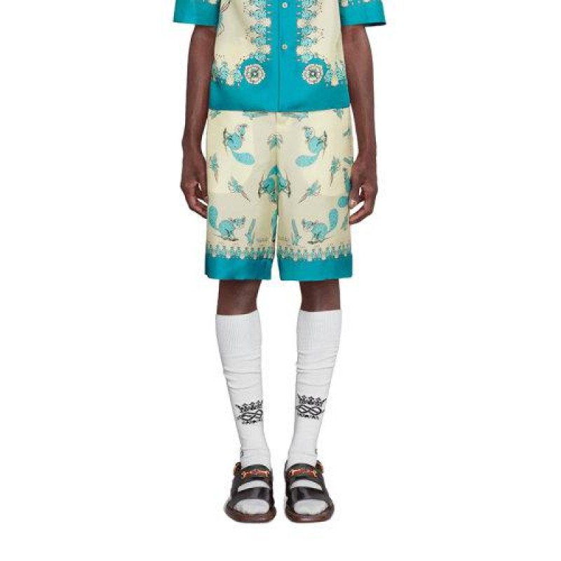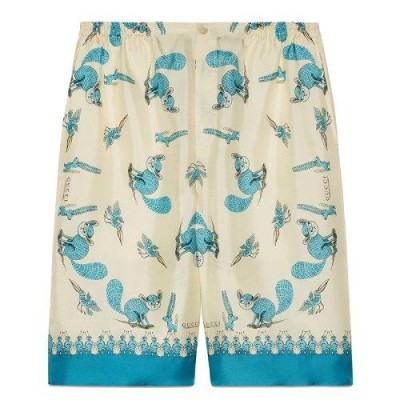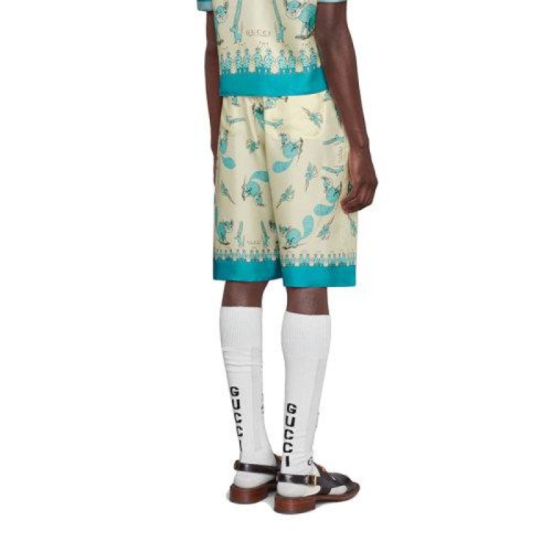 【包税】GUCCI/古驰 21年早秋新款 Freya Hartas系列 男士象牙色和绿色动物印花真丝斜纹布短裤653403ZAGWX4262