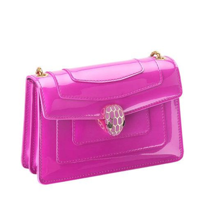 这款迷你Serpenti Forever肩背包采用紫色洋红色尖晶石制成,具有专利和珍珠效果,内部衬里采用黑色罗缎。蛇形手扣,金色黄铜和全哑光珐琅色紫色洋红色尖晶石,on玛瑙眼睛。农历新年特别版。