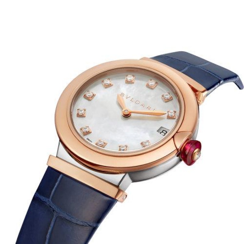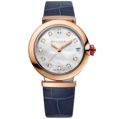 【 Tax included 】 Book 2-3 weeks BVLGARI/Bulgari 18K gold rose gold and stainless steel case with white mother of pearl dial, diamond studded hour markers, date window, and blue crocodile leather strap LVCEA automatic mechanical watch 33mm 102638