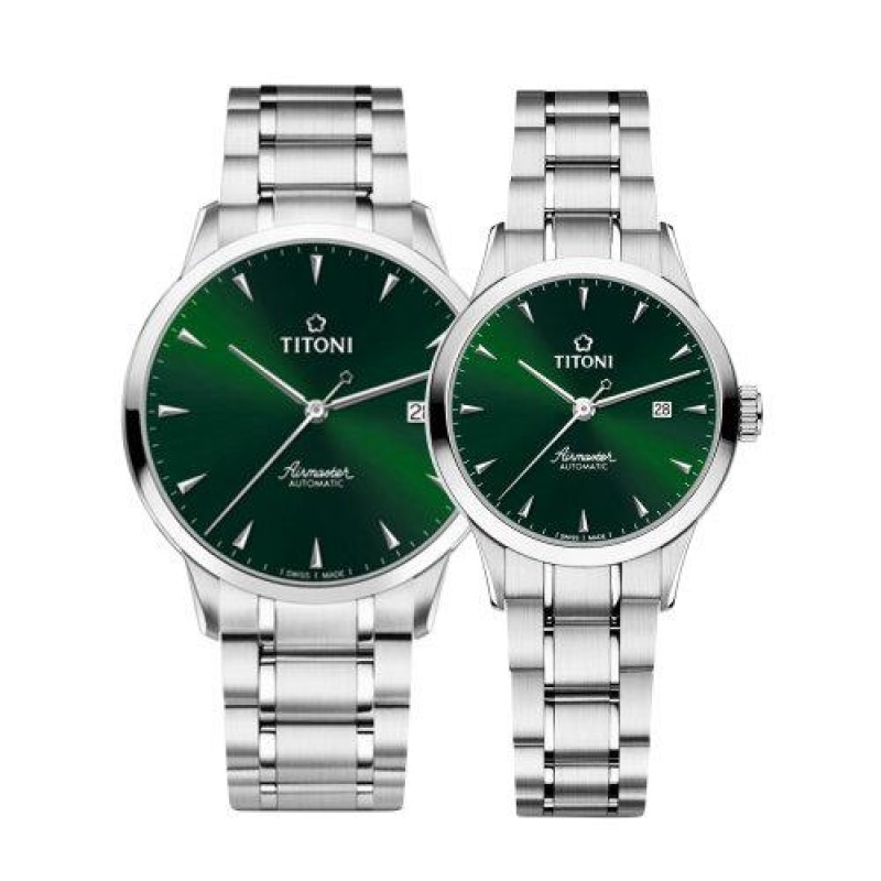 TITONI/梅花瑞士手表 空霸系列 时尚优雅休闲商务款 自动机械男女款 情侣表 对表 绿盘钢带 23733/83733 S-673