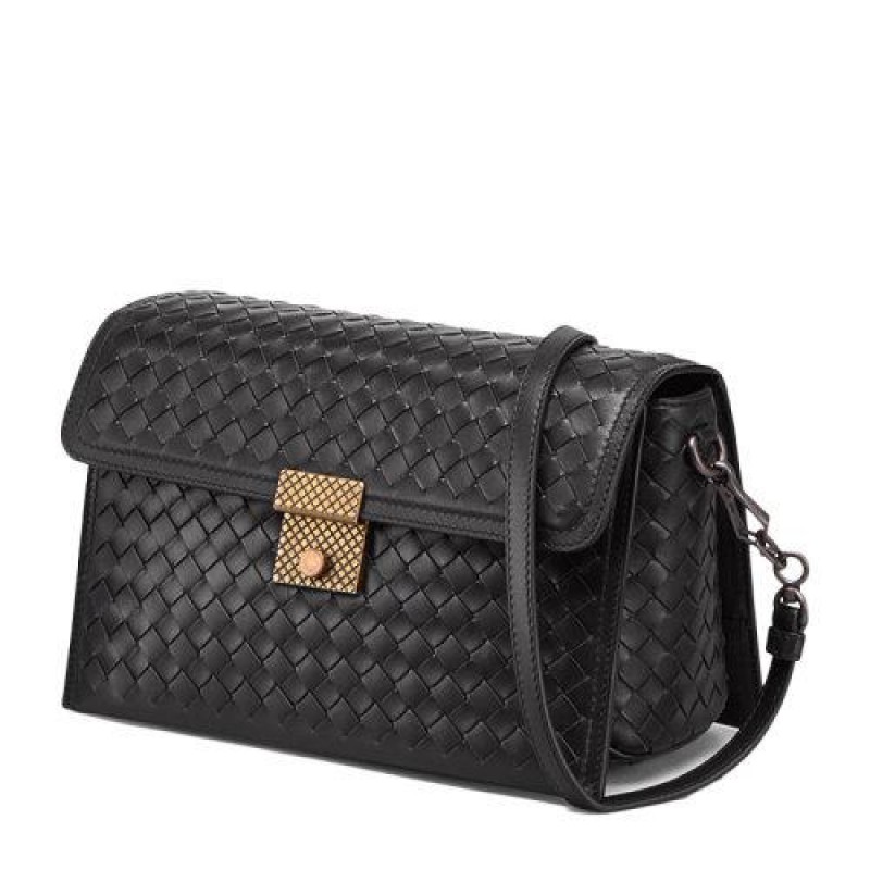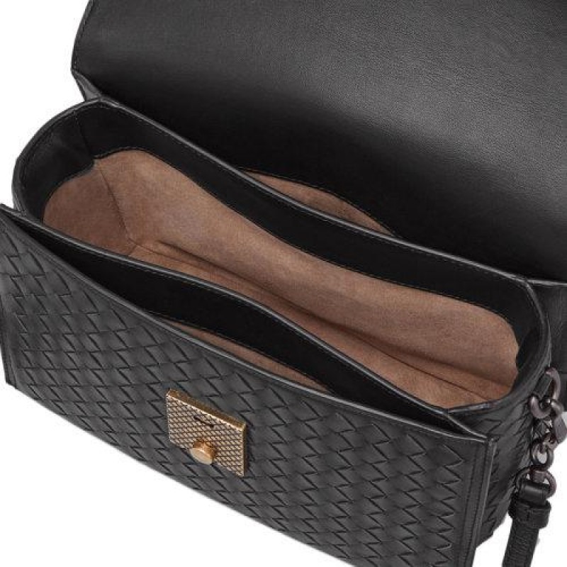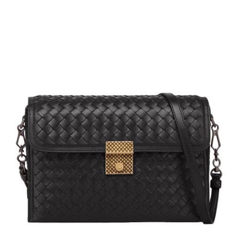 Bottega Veneta/葆蝶家 INTRECCIATO系列女士黑色羊皮经典编织款时尚翻盖小号单肩包斜挎包邮差包女包 463700-AUQ3-1000