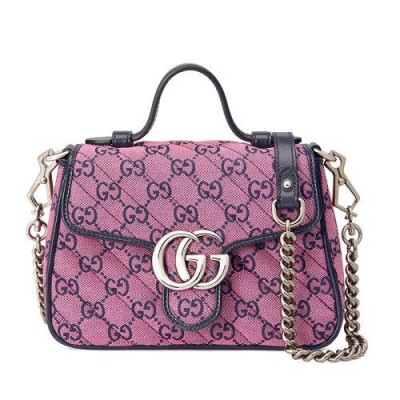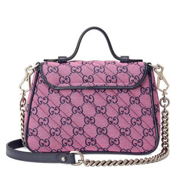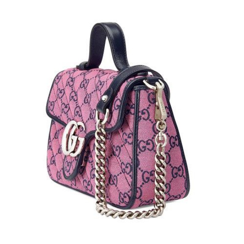 【包税】GUCCI/古驰 2021春夏新款 GG Marmont Multicolor系列 迷你女士粉色和蓝色GG帆布GG钻石图案银色饰面翻盖双G扣手提单肩斜挎包5835712UZCN5279