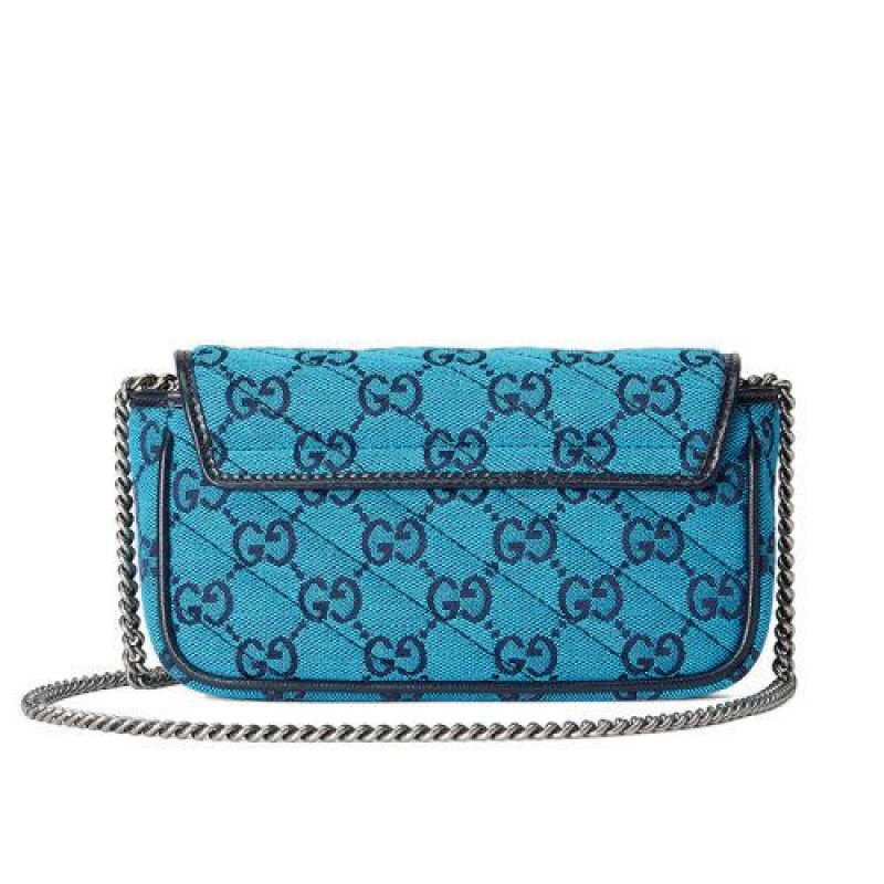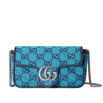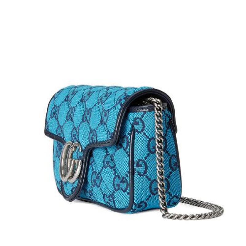 【包税】GUCCI/古驰 2021春夏新款 GG Marmont系列 super mini女士淡蓝色和蓝色GG帆布银色饰面双G扣斜挎单肩手提包4764332UZCN4164