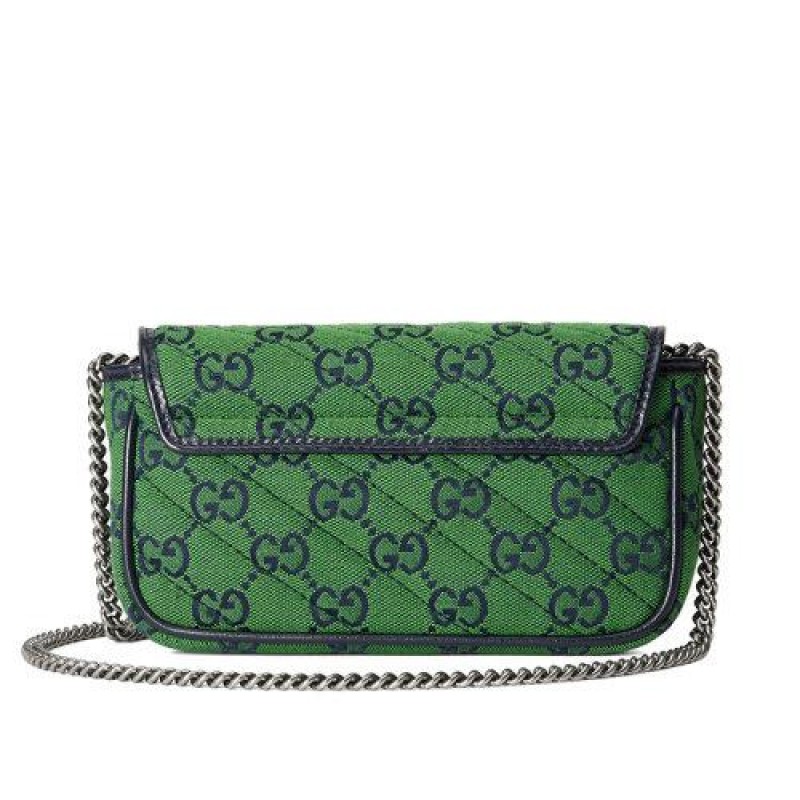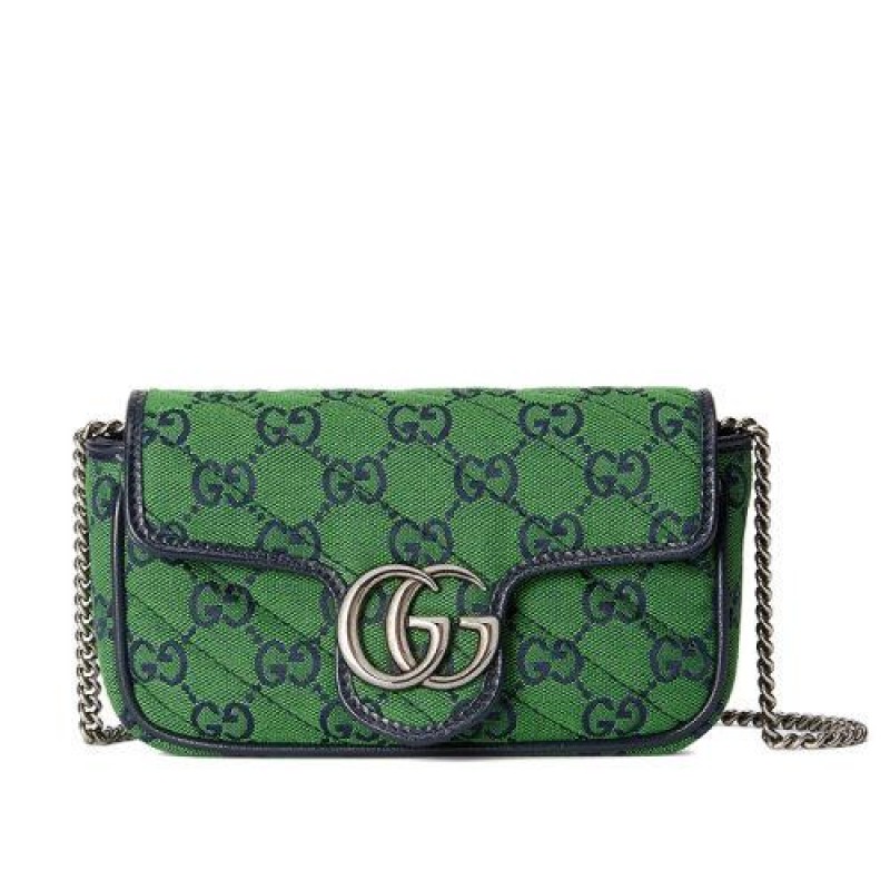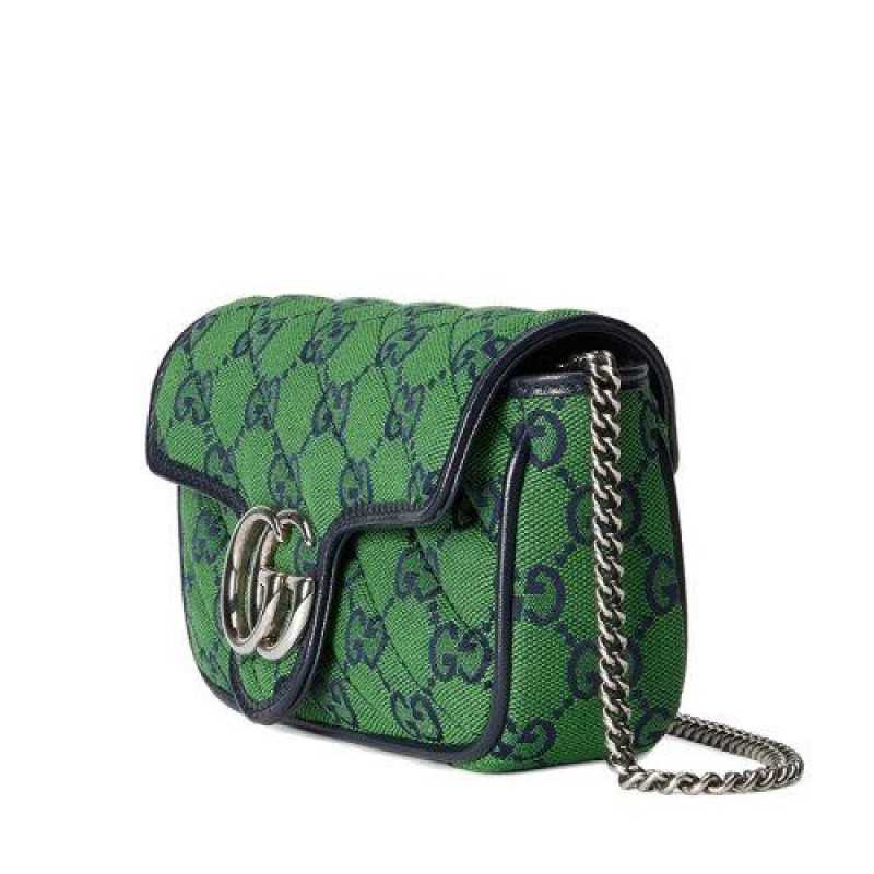 【包税】GUCCI/古驰 2021春夏新款 GG Marmont系列 GG Multicolor super mini女士绿色GG帆布银色饰面双G扣斜挎单肩手提包4764332UZCN3368