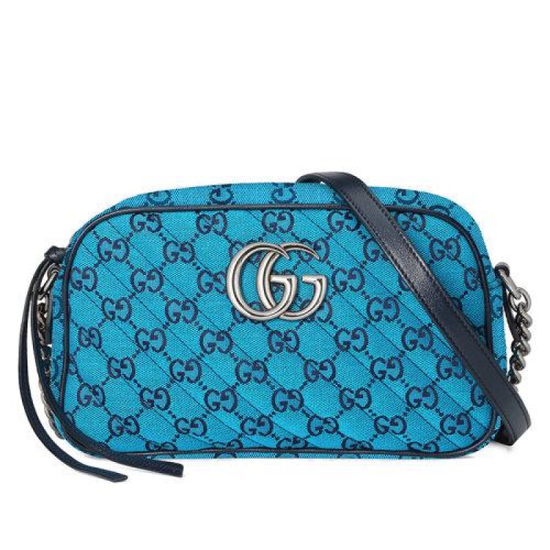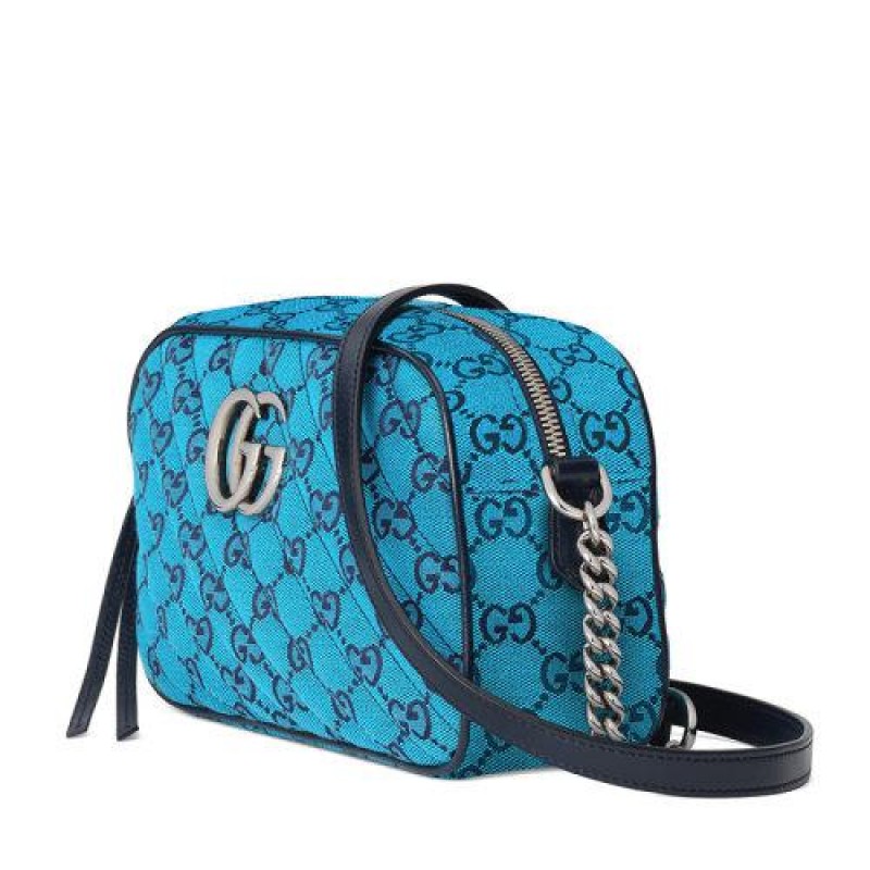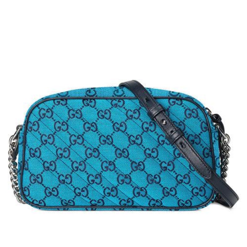 【包税】GUCCI/古驰 2021春夏新款 GG Marmont系列 小号女士浅蓝/蓝色GG帆布拉链银色饰面双G徽标斜挎单肩手提包4476322UZCN4164