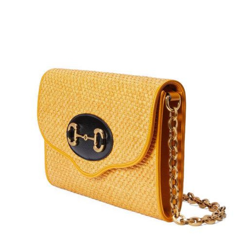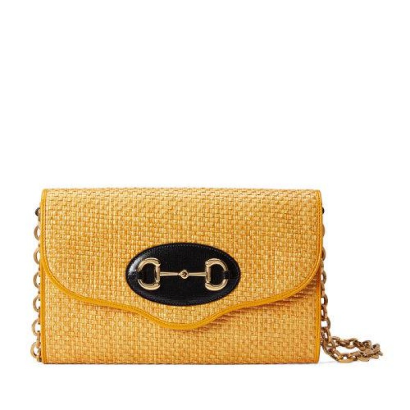 【包税】GUCCI/古驰 2021春夏新款 Horsebit 1955系列 女士小号黄色稻草织物单肩斜挎手拿包6556672VAAX7673