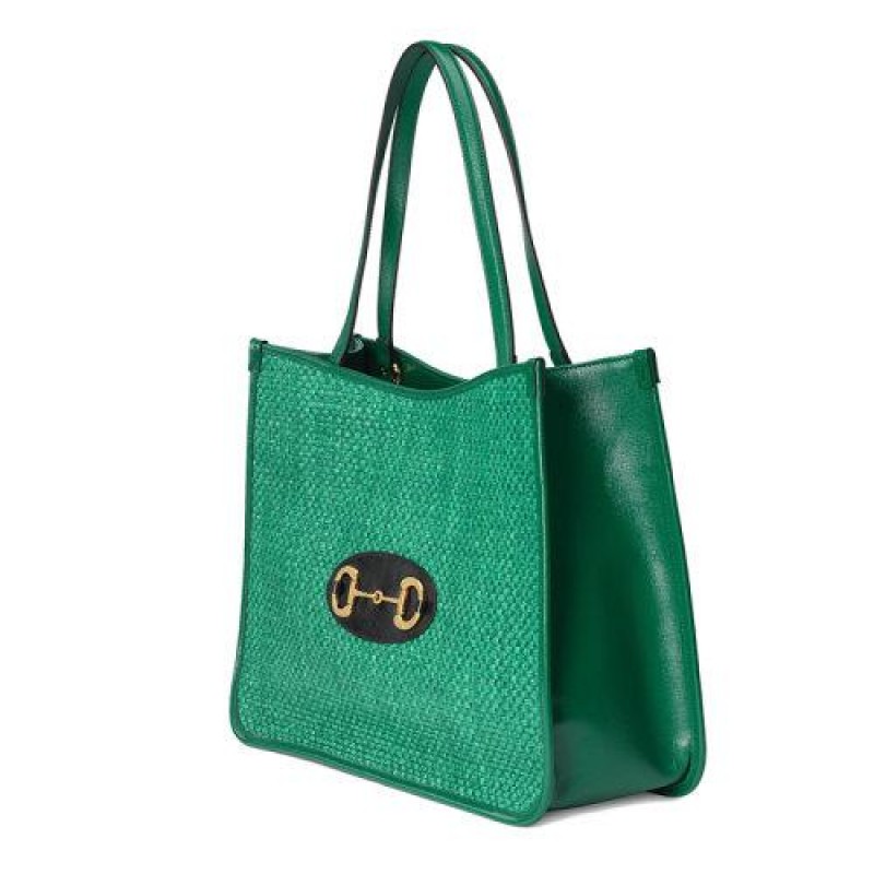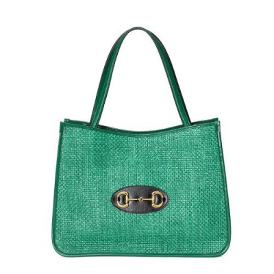 【包税】GUCCI/古驰 2021春夏新款 Horsebit 1955系列 女士翠绿色稻草织物单手提包6236942VAAG3189