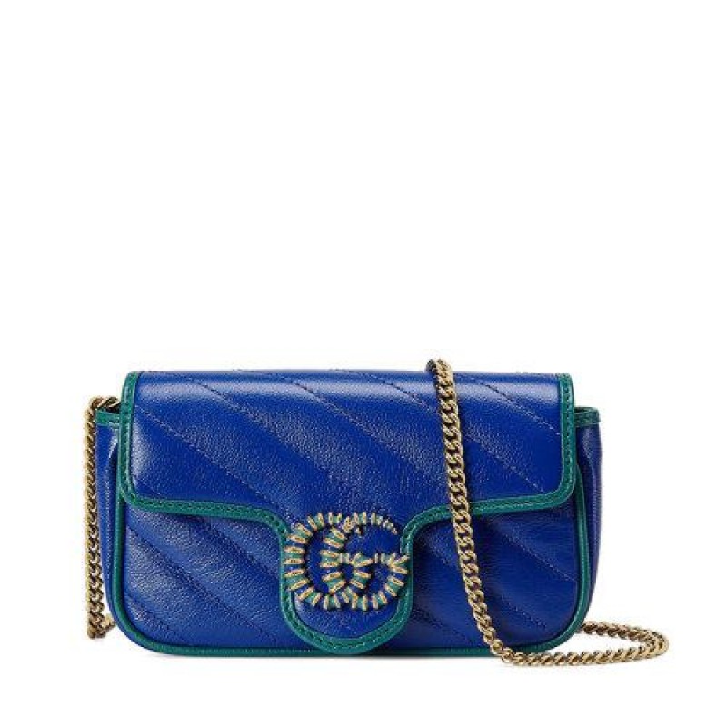 唤起宝石,Maison's Beloved宇宙的轮廓装饰有阴影,并带有珠宝装饰的宝石色调,以用于精品系列。超级迷你GG Marmont包在这里呈蓝色,灵感来自蓝宝石。珐琅增强版中饰有该系列标志性的Double G细节。