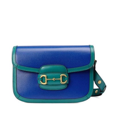 【包税】GUCCI/古驰 2021春夏新款 Horsebit 1955系列 女士小号蓝色和绿松石色皮革马衔扣单肩斜挎手提包6022041DBAG8381
