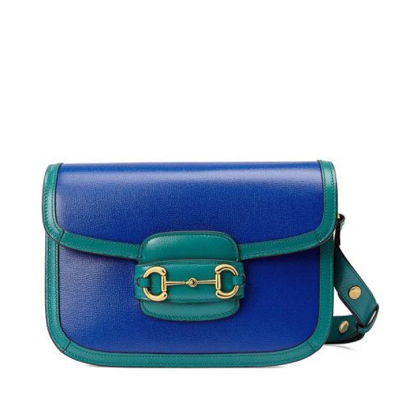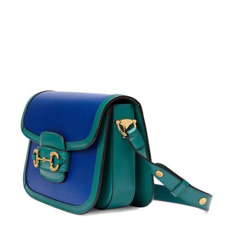 Beloved系列的标志性轮廓装饰有鲜艳的色彩和宝石味。Gucci Horsebit 1955腕表采用蓝色和绿色皮革制成,带有对角线缝饰面。单肩包饰有其独特的Horsebit细节。