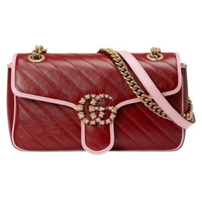 这款GGMarmont系列手袋采用深红色皮革制作,饰以柔和的淡粉色滚边,令人联想起红宝石的颜色。该肩背包上还饰有具有辨识度的双G配件和同色调细节。