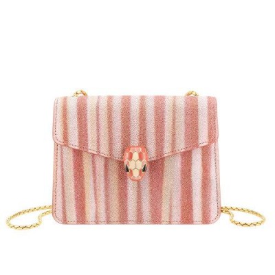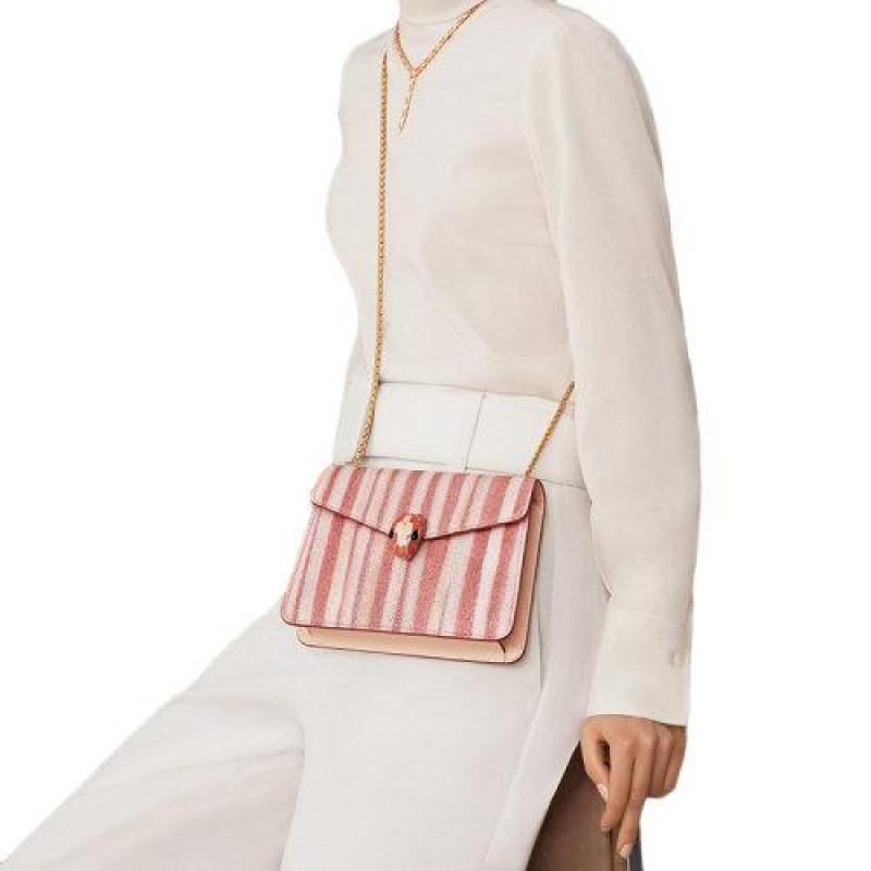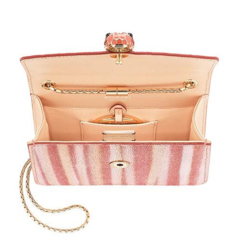 【包税】预订款 BVLGARI/宝格丽 2021春夏新款SERPENTI FOREVER系列 女士小号彩色条纹珍珠鱼皮桃红色小牛皮哑光黑色桃红色珐琅扣链条单肩斜挎包290557