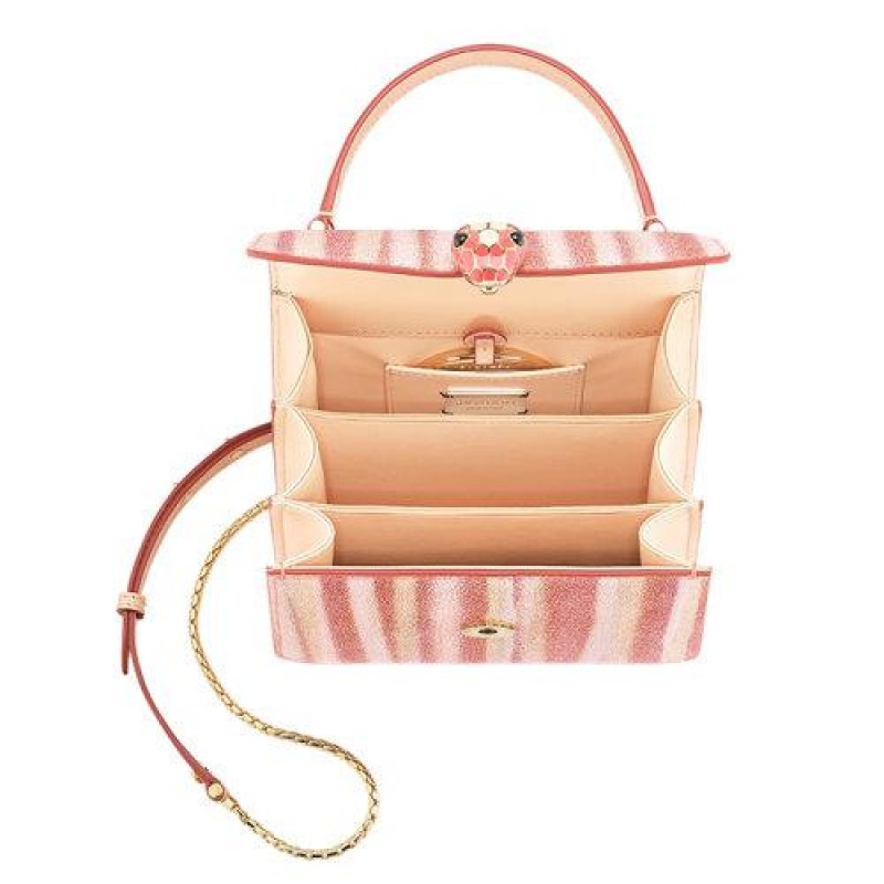 Serpenti Forever单肩包,多色“ Ministriped”珍珠鱼皮,桃红色小牛皮侧面,桃红色纳帕皮衬里。诱人的蛇头扣环采用金色黄铜制成,黑色和桃红色珐琅完全哑光,with玛瑙眼睛。