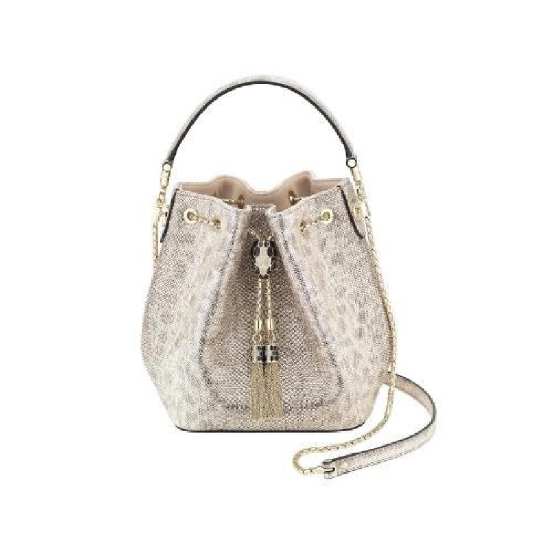 La famille Serpenti Forever accueille un nouveau membre : le sac seau tendance. Ce modele en karung raffine effet metallise couleur Milky Opal illustre la capacite des artisans Bvlgari a transformer des materiaux precieux en des pieces intemporelles. Les cordons fonctionnels de ce sac sont reinterpretes dans le style Bvlgari : ils prennent la forme de chaine a motif en ecailles, completes par le fermoir emblematique Serpenti en email noir et couleur Milky Opal scintillant avec yeux en onyx au cha*W*rme irresistible. L’anse amovible et la chaine en forme de serpent en laiton dore assurent un look confortable et polyvalent. Petit modele dote d’un compartiment a soufflet et d’une plaque en metal ornee du logo Bvlgari a l’interieur. Dimensions : 16 x 19 x 10 cm.