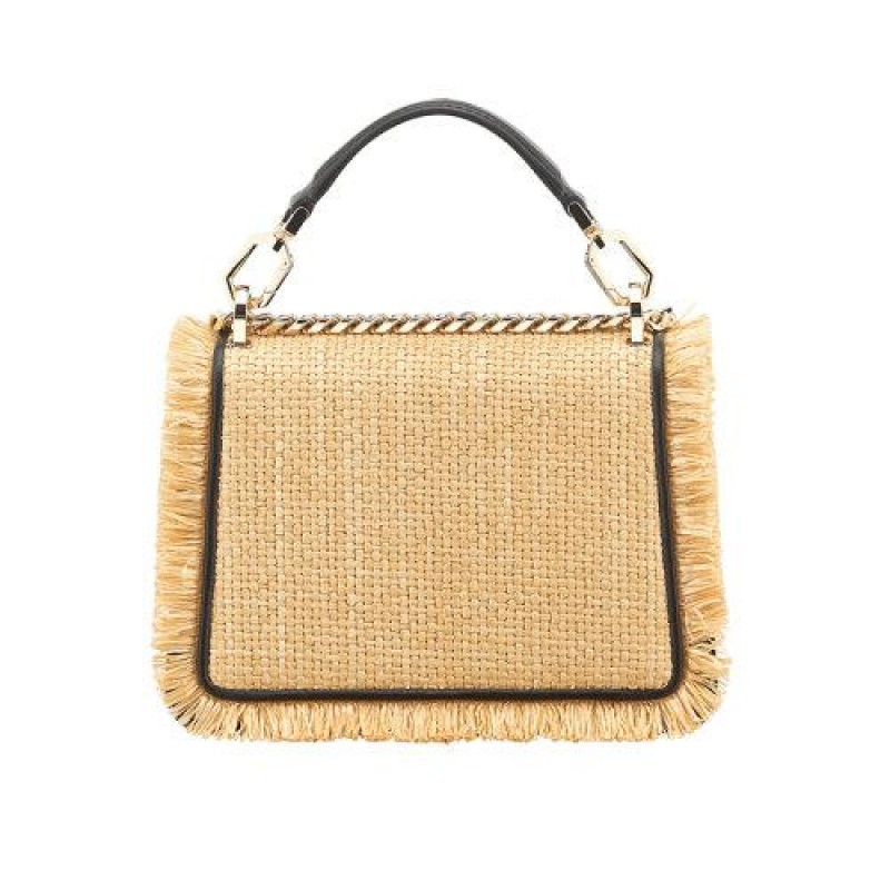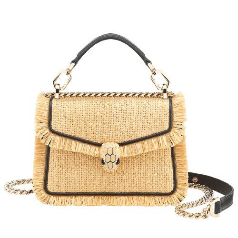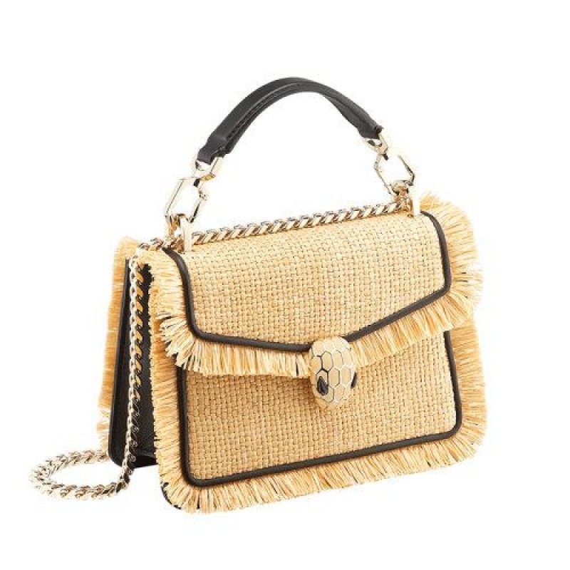 【包税】BVLGARI/宝格丽 2021春夏新款 SERPENTI DIAMOND BLAST系列 女士米色酒椰叶纤维黑色小牛皮边缘金色黄铜蛇头表扣可拆卸提手单肩斜挎手提包290914