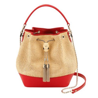 Serpenti Forever小号水桶包,米色酒椰纤维和Carmine Jasper红色小牛皮,配Carmine Jasper红色纳帕皮革衬里。迷人的Serpenti金色黄铜表扣,搭配天然哑光珐琅,纯天然米色和with玛瑙双眼。