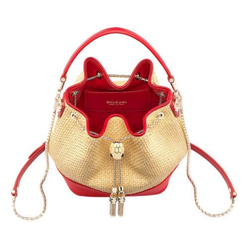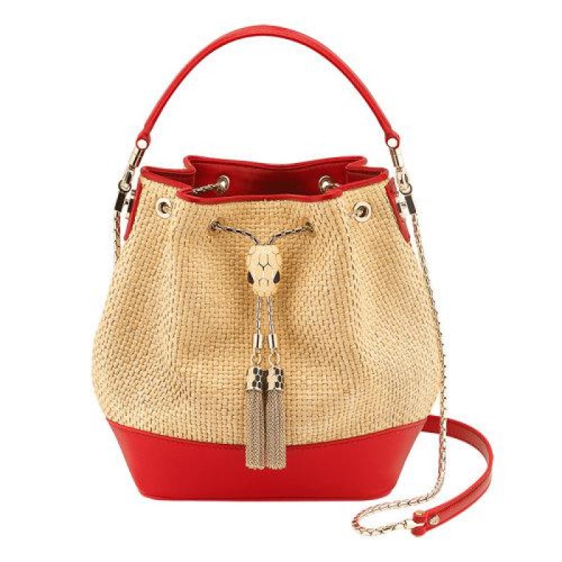 【包税】BVLGARI/宝格丽 2021春夏新款 SERPENTI FOREVER系列 女士小号米色酒椰纤维Carmine Jasper红色小牛皮黄铜蛇头表扣水桶单肩斜挎手提包290959