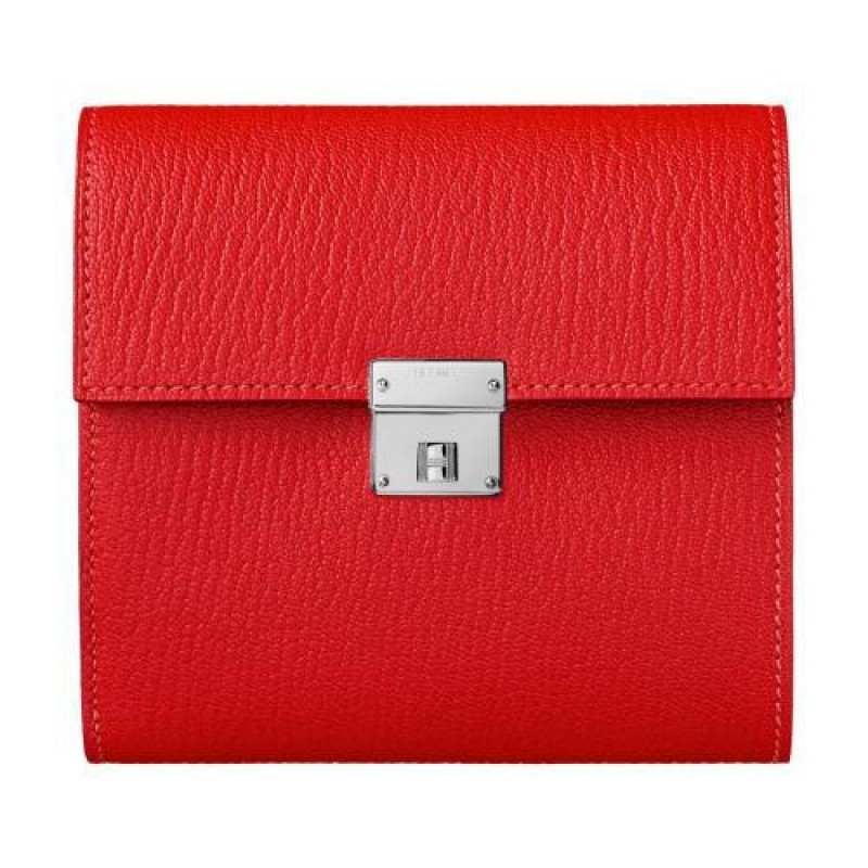 Portefeuille en chevre Mysore, bijouterie argentee palladieea l’interieur : un porte-monnaie avec fermeture a glissiere, cinq poches cartes de credit, une poche carte d’identite, une poche financiereUne ligne aux formats carres qui met en valeur le fermoir inspire des serrures des annees 1960 et de la gravure H raye du cadenas de nos sacs.