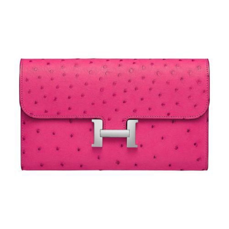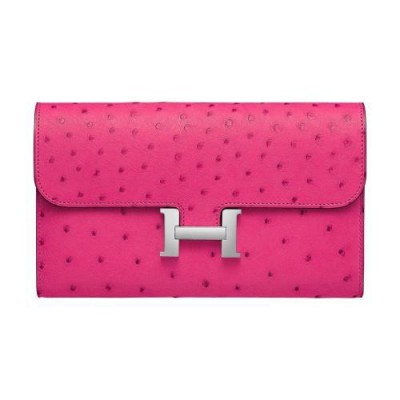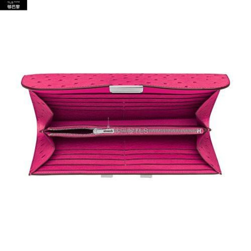 Portefeuille long en autruche, fermoir plaque ora l’interieur : un porte-monnaie central avec fermeture a glissiere, douze poches cartes de credit et deux poche*esa l’exterieur : une poche arriere et une poche avant