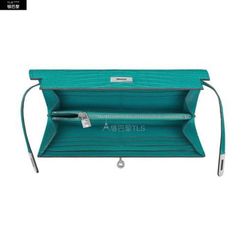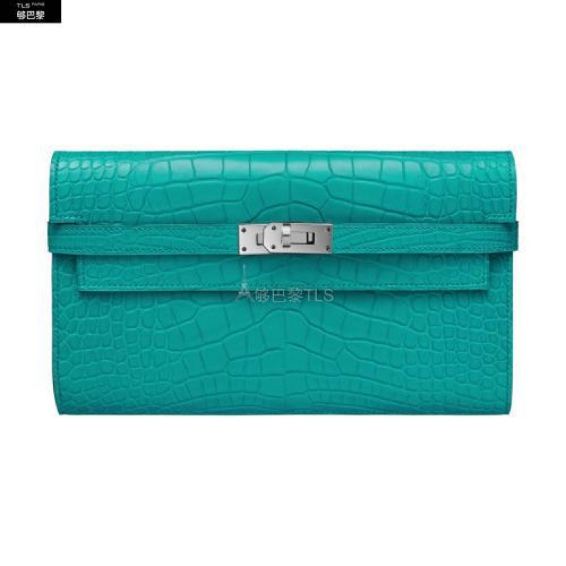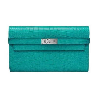 Portefeuille long en alligator Mississippiensis mat, ferme par des sanglons et un fermoir argente palladiea l’interieur : un porte-monnaie avec fermeture a glissiere, douze poches cartes de credit et deux poches financieres