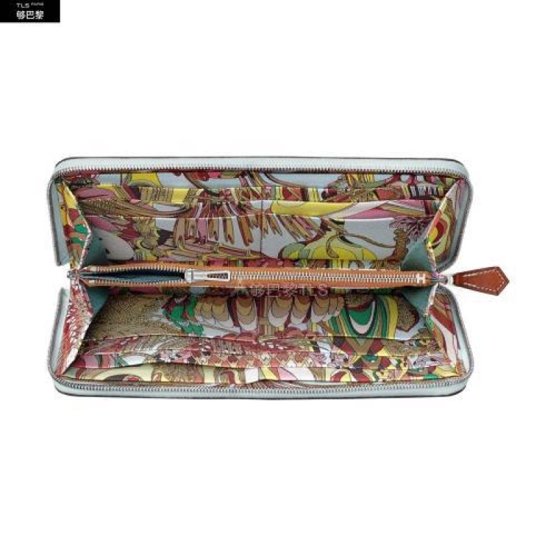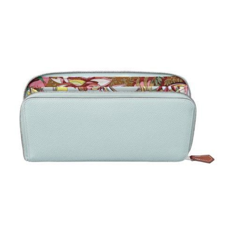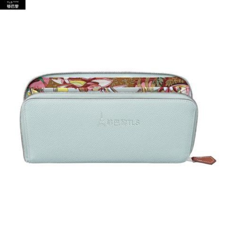 Portefeuille combine en veau Epsom, double en twill de soie imprime "Fantaisie Botanique", fermeture a glissiere argentee palladiee.A l'interieur: une poche monnaie zippee, quatre poche*es et douze poches cartes de credit