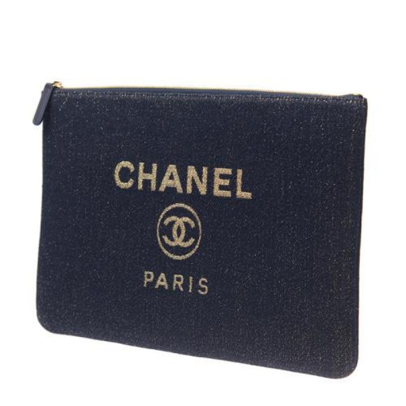 【包税】Chanel/香奈儿 女士蓝色经典logo标识帆布手拿包