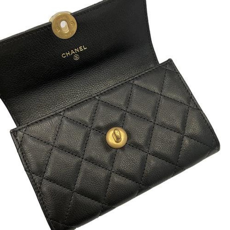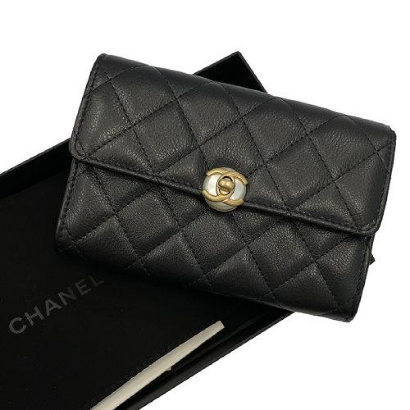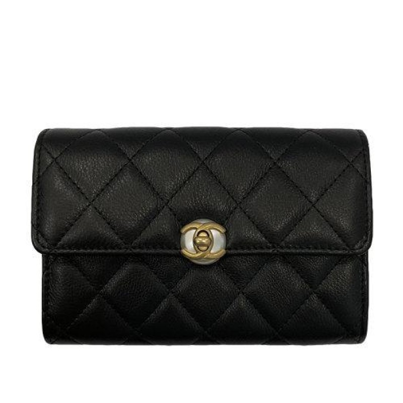 【 Tax included 】 CHANEL/Chanel Classic Black Natural Texture Leather White Resin Pearl Jewelry Gold Metal Double C-Button Wallet