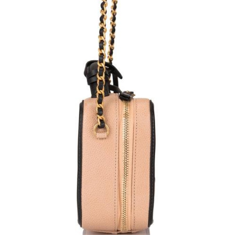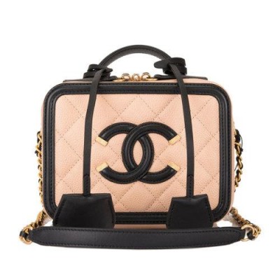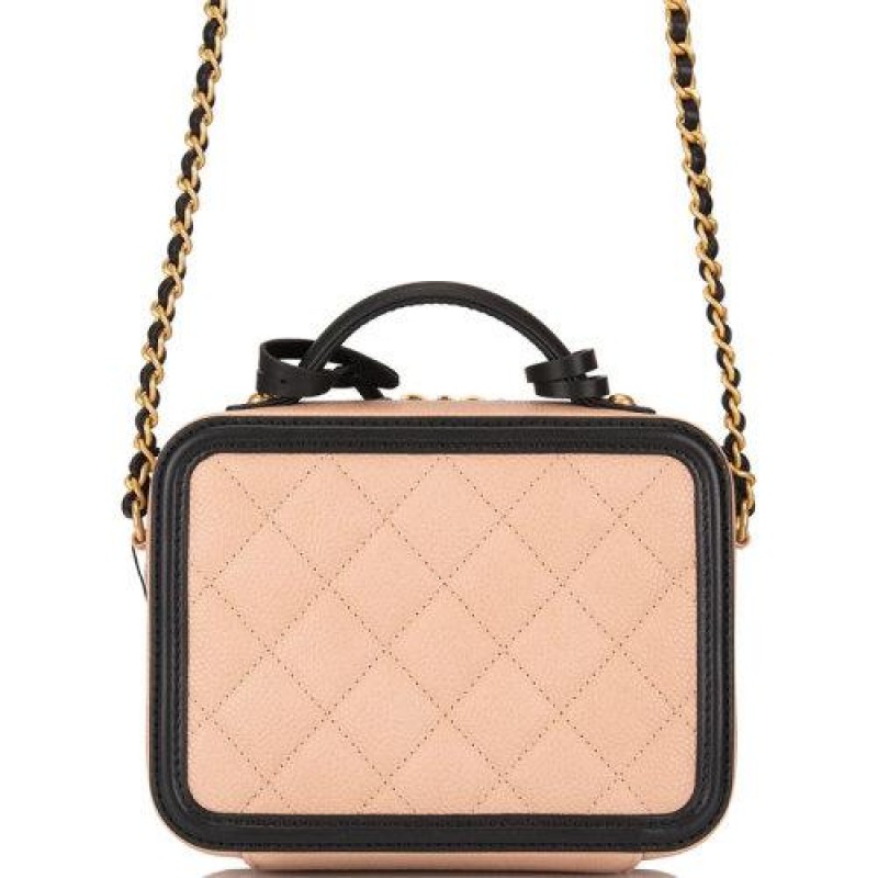 【包税】现货 CHANEL/香奈儿 经典 Filigree Vanity Case浅米色和黑色鱼子酱皮 金色五金链条化妆箱包单肩包