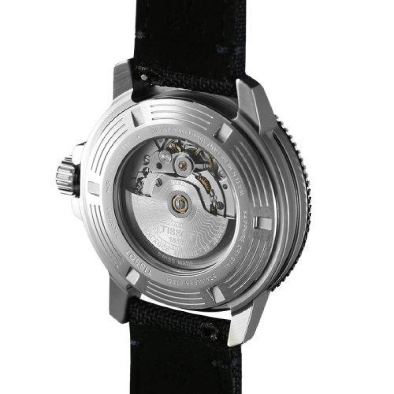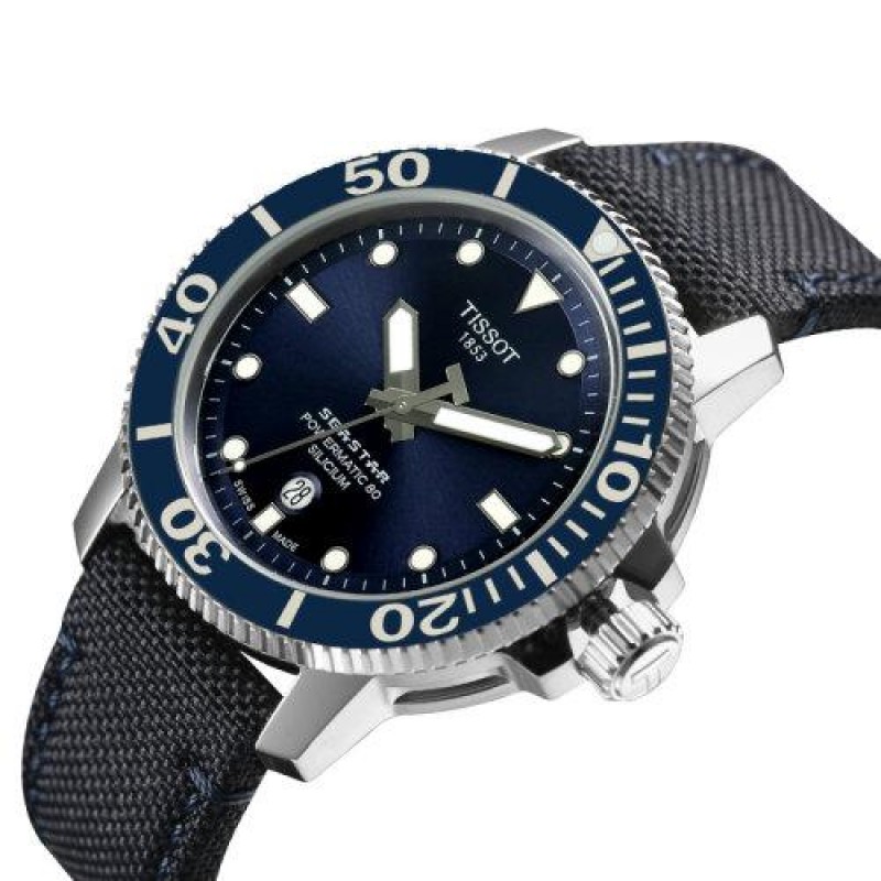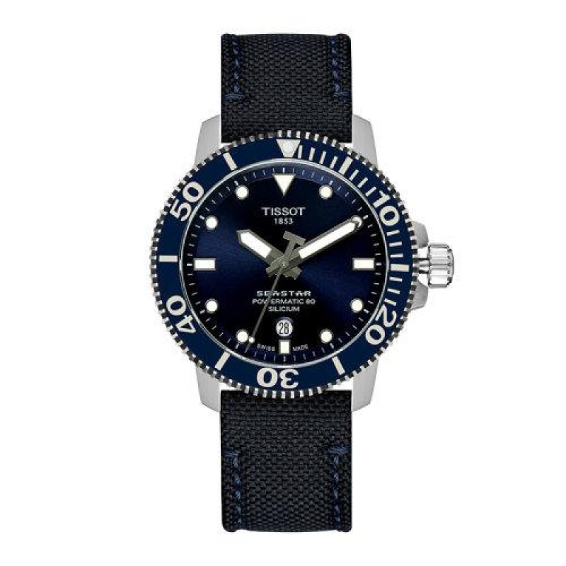 TISSOT/天梭瑞士手表 海星系列织物自动机械运动潜水男士腕表 皮带蓝盘T120.407.17.041.01