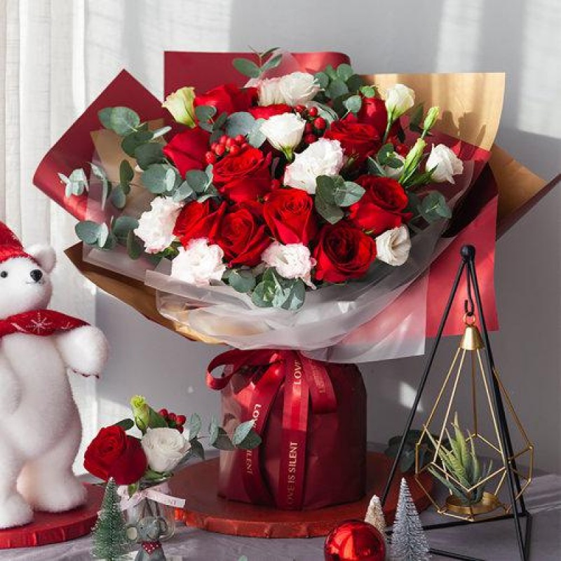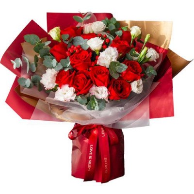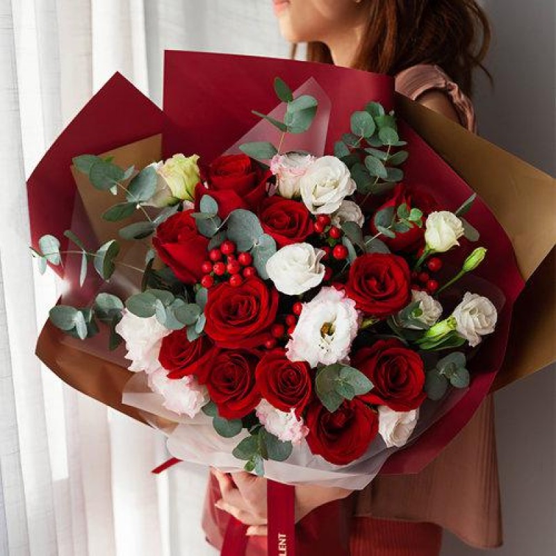 花礼/韩式系列/初心不负/卡罗拉玫瑰11枝、白底粉边洋桔梗、大叶尤加利鲜花/七夕情人节礼物鲜花/当日达 $37.3 |