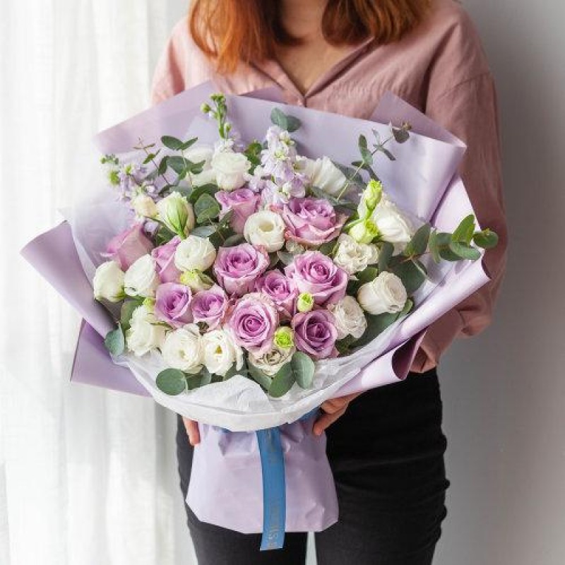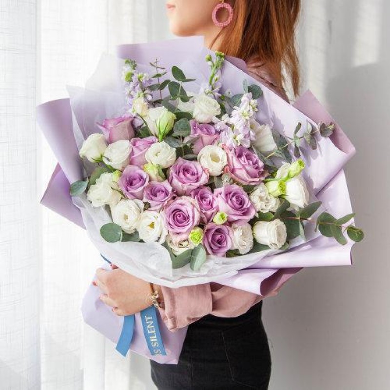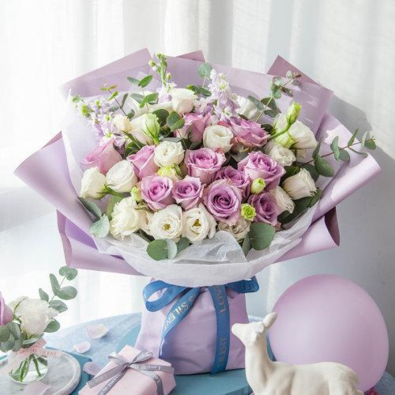 花礼/韩式系列/着迷/紫霞仙子玫瑰11枝、洋桔梗、尤加利、紫罗兰//七夕情人节礼物鲜花/当日达