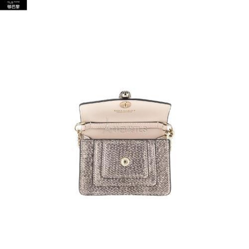 Bijou de sac Serpenti Forever miniature en karung metallise couleur Milky Opal avec doublure en cuir de veau couleur Sea Star Coral. Fermoir pression Serpenti emblematique en laiton dore et email noir et couleur Milky Opal scintillant avec yeux en email noir. Chaine en forme de serpent amovible d'un cote, un compartiment et logo en metal. Dimensions : 10,5 x 7,5 x 2 cm.
