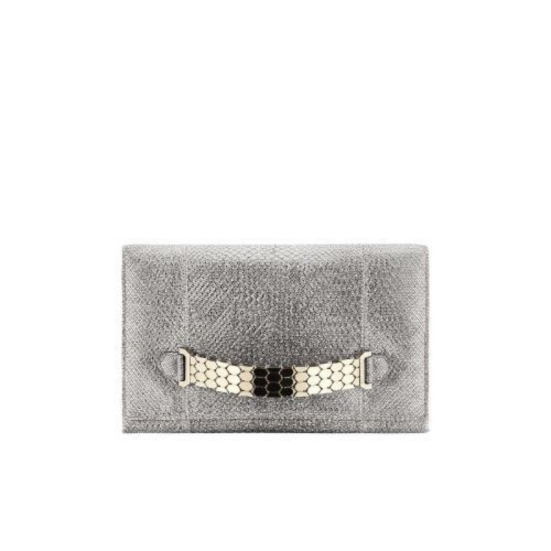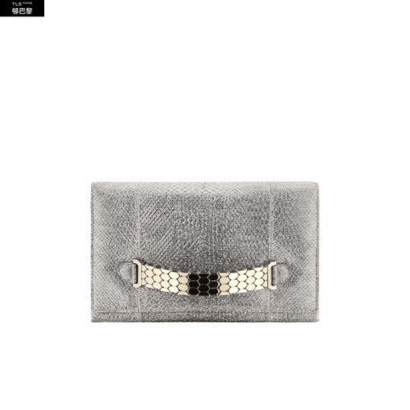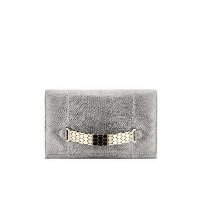 La famille Serpenti Evening accueille une nouvelle creation qui vient enrichir la collection de pochettes. Ce modele en karung metallise raffine couleur blanc agate illustre la capacite des artisans Bvlgari a transformer des materiaux precieux en des pieces intemporelles. Inspiree du bracelet Serpenti Seduttori ornant nos montres pour femme, une ravissante poignee doree rehausse l’avant de cette piece d’une touche sophistiquee et brillante. Petit modele dote de deux compartiments a soufflet, d’une poche ouverte, d'un fermoir a bouton-pression et d’une plaque en metal ornee du logo Bvlgari. Dimensions : 14 x 22 x 3,5 cm.