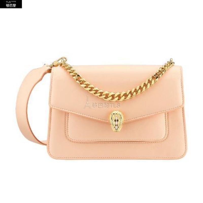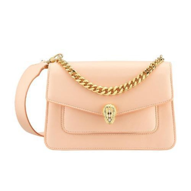 La famille Serpenti Forever accueille un nouveau sac a bandouliere qui affiche une silhouette resolument contemporaine a l’es*W*prit urbain. Confectionne en cuir nappa doux couleur peche, ce sac a chaine maxi arbore des details en laiton dore. Ce modele est orne d'une nouvelle interpretat*w*ion du fermoir Serpenti en laiton dore, inspire par une ancienne montre Bvlgari des annees 60, avec petites ecailles en nacre rose et yeux en email rouge. Clin d’oeil a l’ame du joaillier, une chaine Bvlgari emblematique ton sur ton orne le rabat a l’image d’un collier, qui peut egalement se convertir en une poignee raffinee. Moyen modele avec un compartiment et une bandouliere en cuir detachable et reglable. Une poche ouverte, une poche zippee de separation et un miroir personnalisable completent ce modele a l'interieur. Une poche avant et une poche arriere plaquee parachevent le sac a l'exterieur. Dimensions : 25 x 1